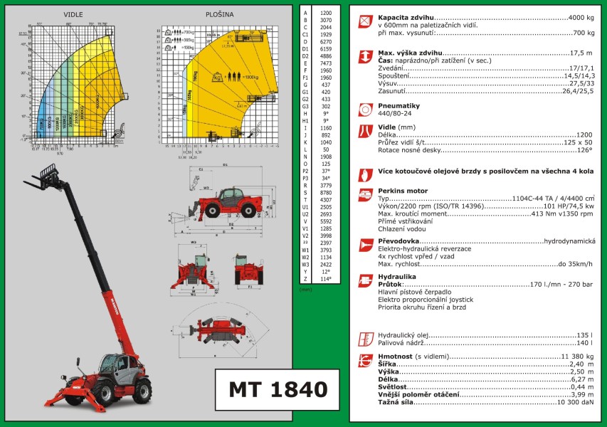 Výškový dosah 18m, nosnost 4t, možné adaptéry: paletizační vidle, lopata 1m3, hák s prodloužením …