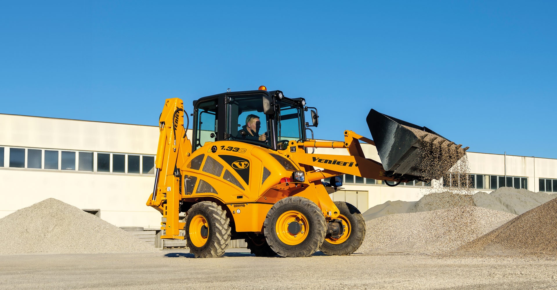 Kompaktní kolový rypadlo-nakladač určený pro práce, kde rozhoduje obratnost, nízká hmotnost a minimální prostor pro manévrování.